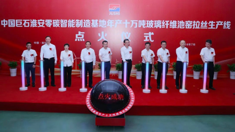 On July 26, 2024, the second glass fiber production line in China Jushi Huai'an Carbon-neutral Intelligent Manufacturing Base was successfully put into operation. Shi Zhijun, Secretary of the Huai'an Municipal Party Committee, Gu Kun, Mayor of Huai’an Municipality, Yang Guoming, President of Jushi, and other officials and business leaders jointly started up the furnace of the line. Secretary Shi and President Yang jointly inaugurated the line. Zhao Zhenglan, Zhang Chonglin, Hong Ran, as well as other officials from the Huai'an municipal government and Lianshui city government attended the inauguration ceremony and toured the new production line. Other Jushi executives including Cao Guorong and Shen Lin were also present at the ceremony.
