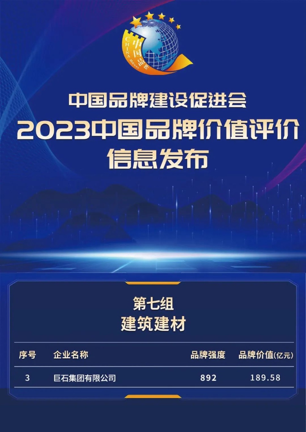 近日,新華社、浙江省人民政府、中國品牌建設(shè)促進(jìn)會(huì)、中國資產(chǎn)評(píng)估協(xié)會(huì)等單位在浙江德清聯(lián)合發(fā)布了“2023中國品牌價(jià)值評(píng)價(jià)信息”。巨石以892的品牌強(qiáng)度和189.58億元的品牌價(jià)值,位列建筑建材行業(yè)(領(lǐng)域)第三位。