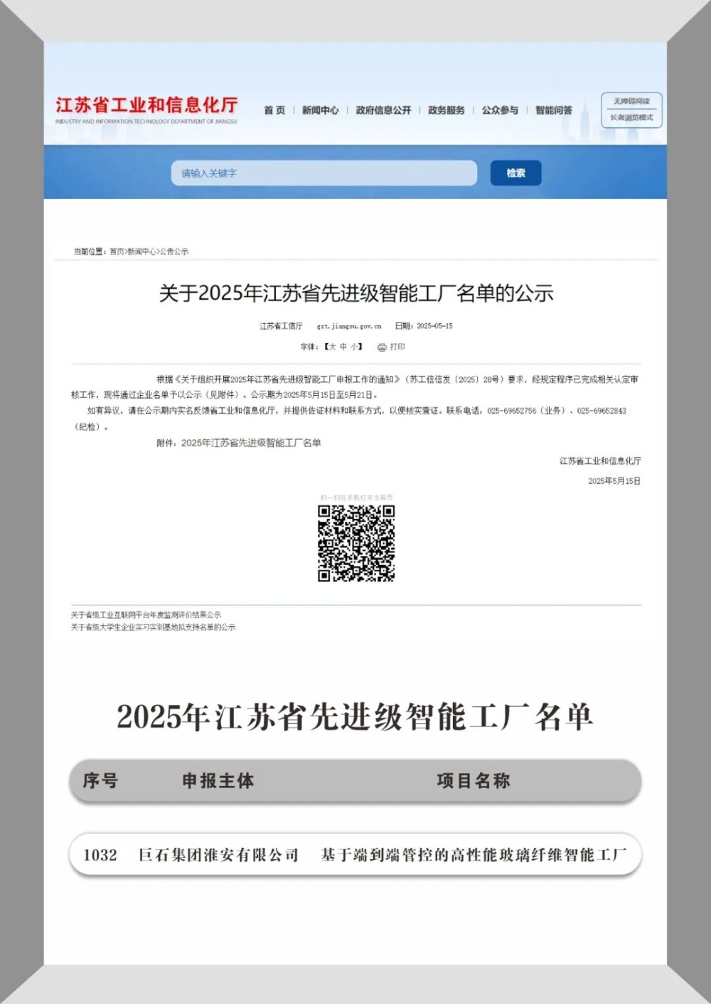 由江蘇省工業(yè)和信息化廳發(fā)布的“2025年江蘇省先進(jìn)級(jí)智能工廠名單”公示的名單中,巨石淮安公司憑借“基于端到端管控的高性能玻璃纖維智能工廠”成功入選江蘇省先進(jìn)級(jí)智能工廠。
