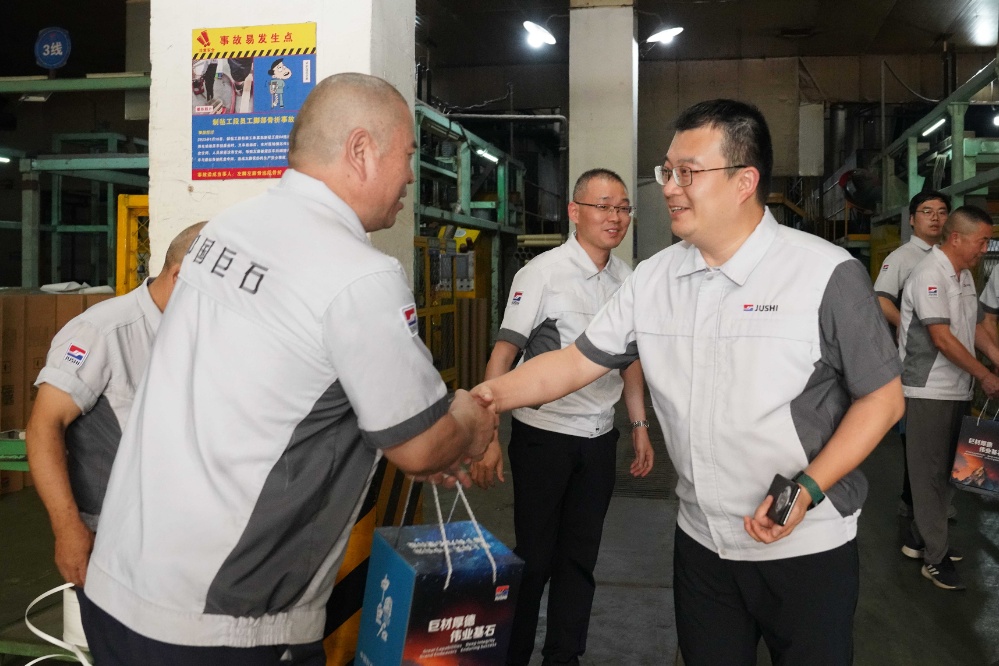 7月16日,中國巨石黨委書記、總裁楊國明帶隊慰問高溫崗位員工,為他們送“清涼”。