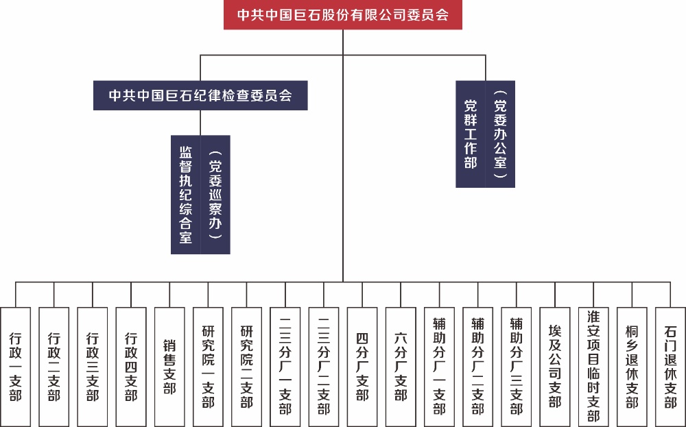 中共巨石集團(tuán)委員會(huì)成立于1996年4月,2015年12月更名為中共中國(guó)巨石委員會(huì)。公司黨委領(lǐng)導(dǎo)班子健全,總裁楊國(guó)明擔(dān)任黨委書(shū)記,黨委副書(shū)記:邵曉陽(yáng),黨委委員:曹?chē)?guó)榮、丁成車(chē)。黨委下設(shè)19個(gè)黨支部,各設(shè)有支部書(shū)記、組織委員、宣傳委員、紀(jì)檢委員等?,F(xiàn)有黨員630人,其中正式黨員620人,預(yù)備黨員10人。中層及以上干部黨員人數(shù)為328人,女黨員103人。碩士以上學(xué)歷57人,其中博士6人。