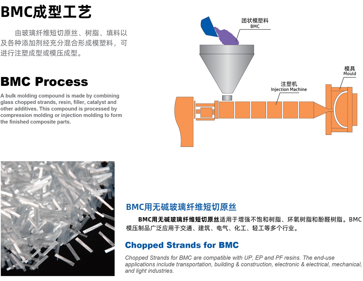 | 440 | 短切分散性好,模壓流動性好制品機(jī)械強(qiáng)度高 Excellent choppability and dispersion, good mold flowability,high mechanical strength of composite products | 門皮、汽車部件 Door skins, automotive parts |
